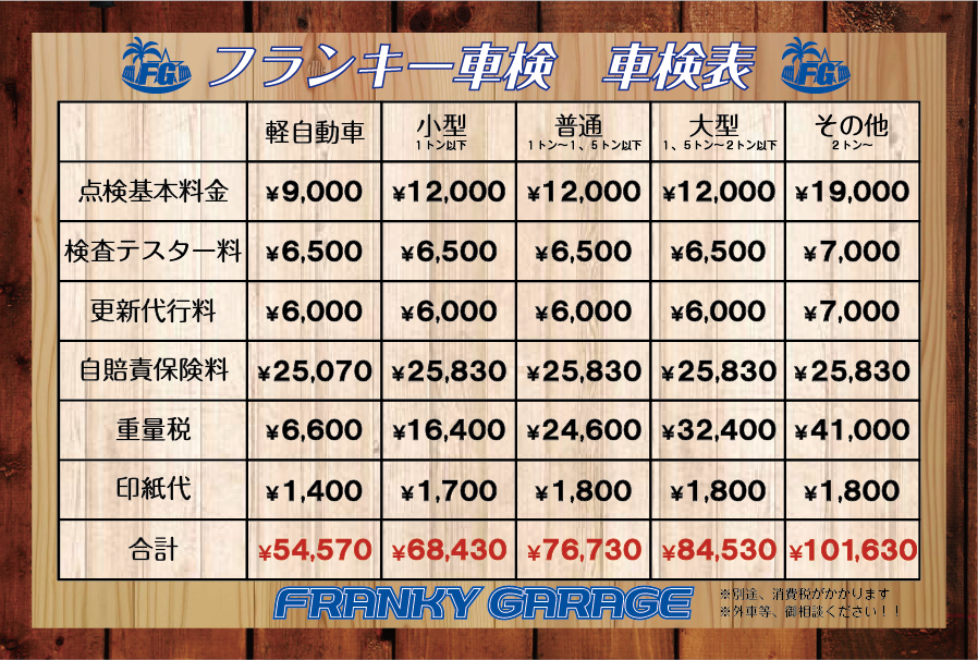 ☆フランキー車検☆ 国土交通大臣認証工場だから安心!! 車検基本料金表 代車無料!様々な割引や特典があります!! ☆タイヤ交換☆ 持ち込み交換も歓迎します! タイヤ交換工賃料金表 22インチまで対応!!スナップオン製タイヤチェンジャー!! ☆オイル交換☆ 化学合成油SN-CF5W30仕様 オイル交換、交換料金表 安い!早い!丁寧!任せて安心!!